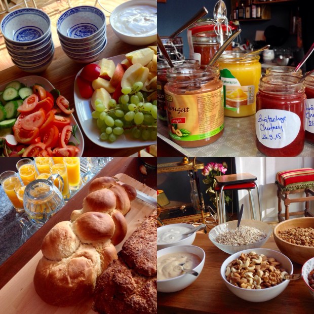 Cafébar Salon now hosts a vegetarian buffet brunch every Sunday. Homemade hummus, guacamole, ricotta cream, delicious jams and cakes, zopf, fruit, soya yoghurt, muesli, pizzetta, fresh fruit juice… the list goes on…